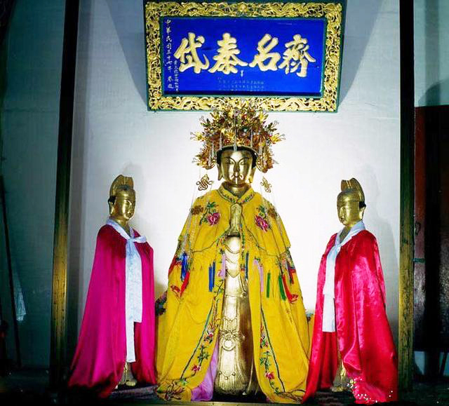 据《泰山道里记》和《岱览》载,唐代前泰山顶上女神早有玉女或元君的称号。自宋代立祠祭祀后,元君信仰兴盛起来。明清两朝,上自帝王皇室,下到村氓民夫,无不崇祀元君。供奉碧霞元君的泰山行宫,一时遍及全国各地,有成千上万座之多。光在京师,娘娘庙就有“三山五顶”之说。