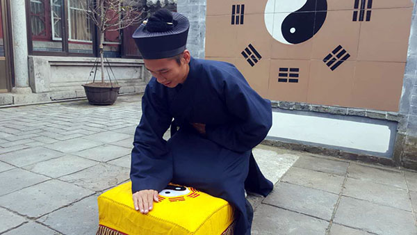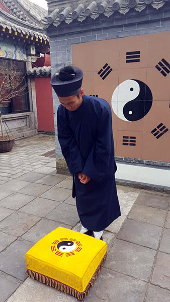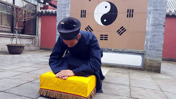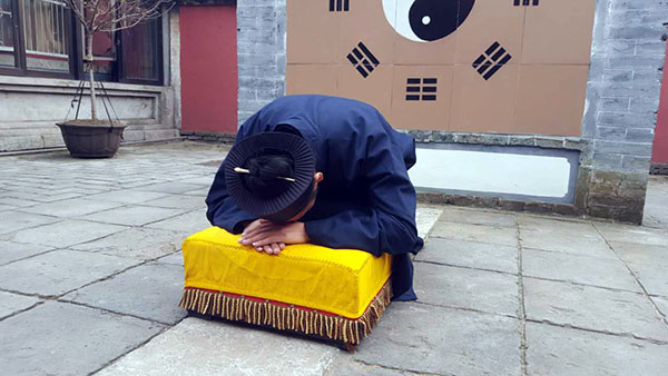 (5)叩首毕起身站定,此为一礼一叩。双手抱拳又一揖,准备第二次叩拜。如上重复两遍,是为三礼三叩。然后向后退半步再作一揖,原地转向值殿道长,躬身一揖,此时三礼三叩礼毕。