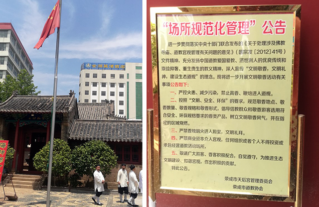 627日,调研组一行先后对荣成市院夼龙王庙、天后宫、圣水观、始皇庙和威海市孙家疃八卦塔道观进行实地走访和调研。此次调研所到宫观,四进活动开展情况良好,均设立有国旗旗杆且悬挂国旗,并设有社会主义核心价值观、《宗教事务条例》、宫观规范化管理制度等各类宣传展板。各宫观重视安全管理,各项管理工作规范有序。