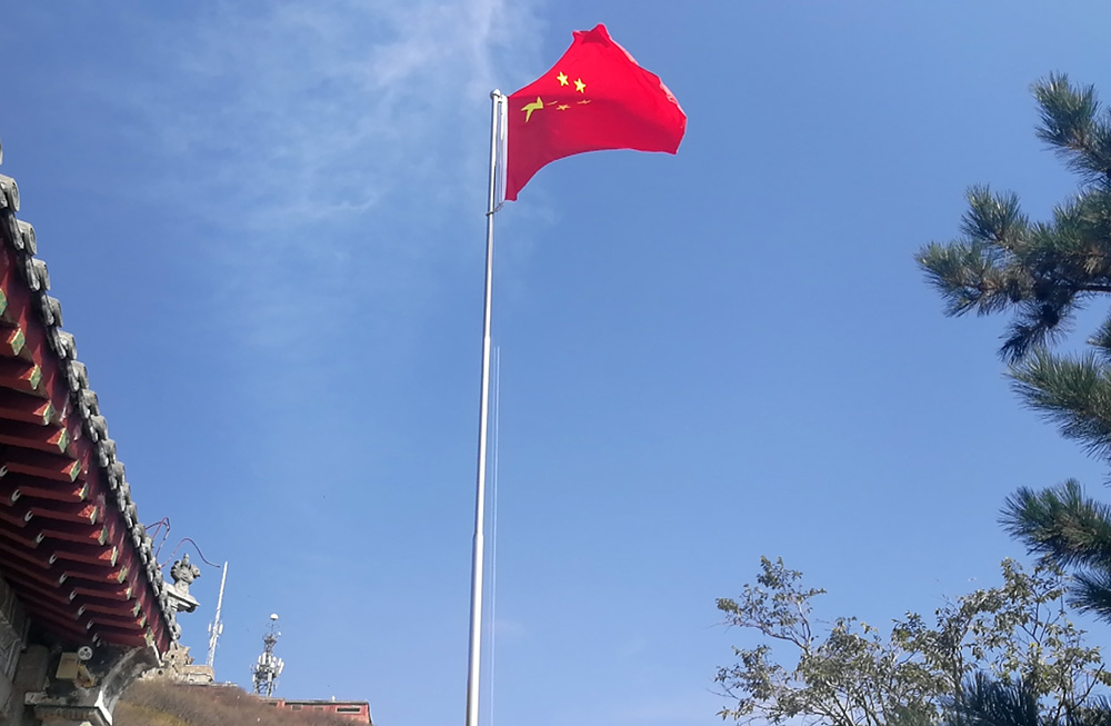 早上8时,泰山碧霞祠住持张诚达道长率领全体道众集体举行升国旗仪式。在激昂雄壮的国歌声中,鲜艳的中华人民共和国国旗在泰山之巅碧霞祠内冉冉升起,全体人员肃立注目,向国旗致敬。