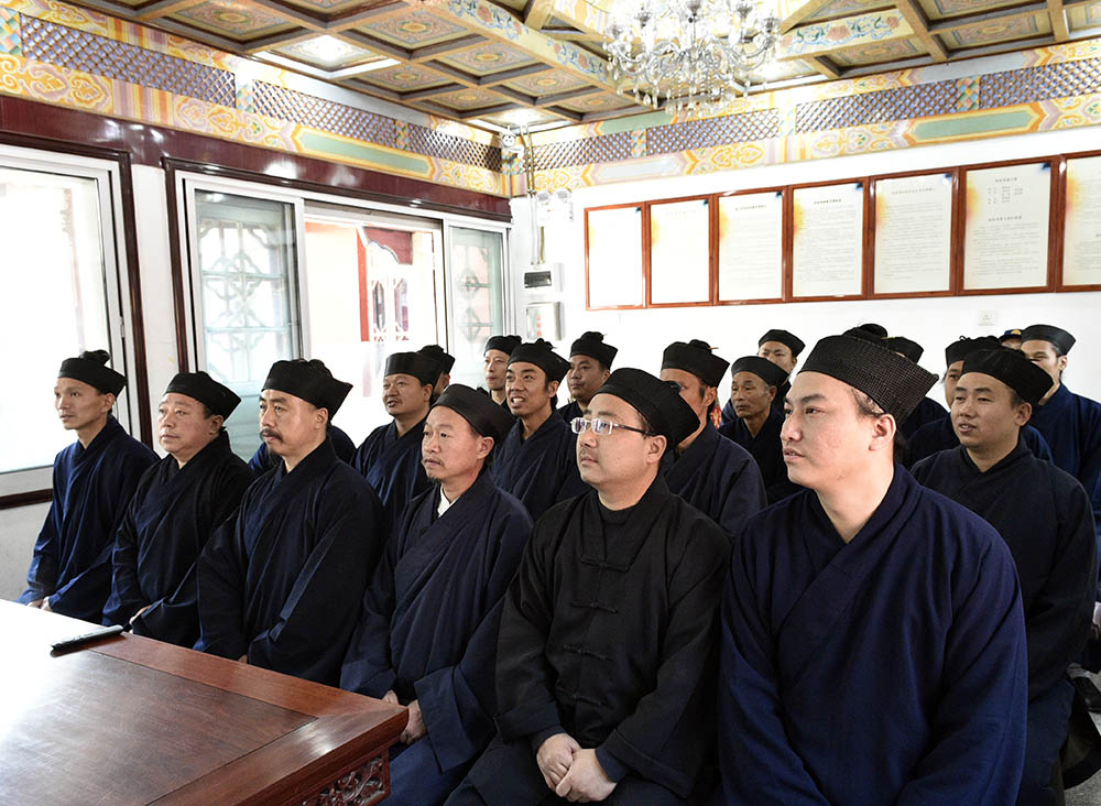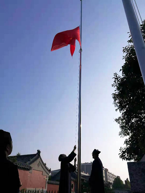 早上8时,泰山灵应宫全体道众在山门前集合,举行庄严的升国旗仪式,致敬祖国。