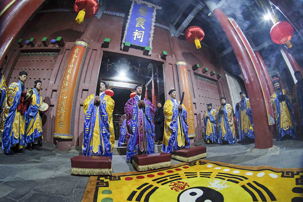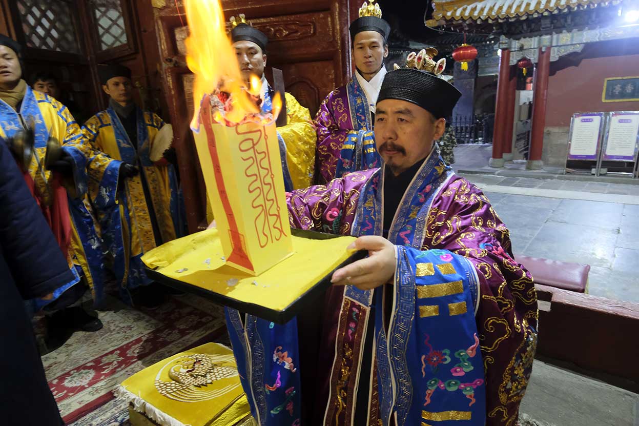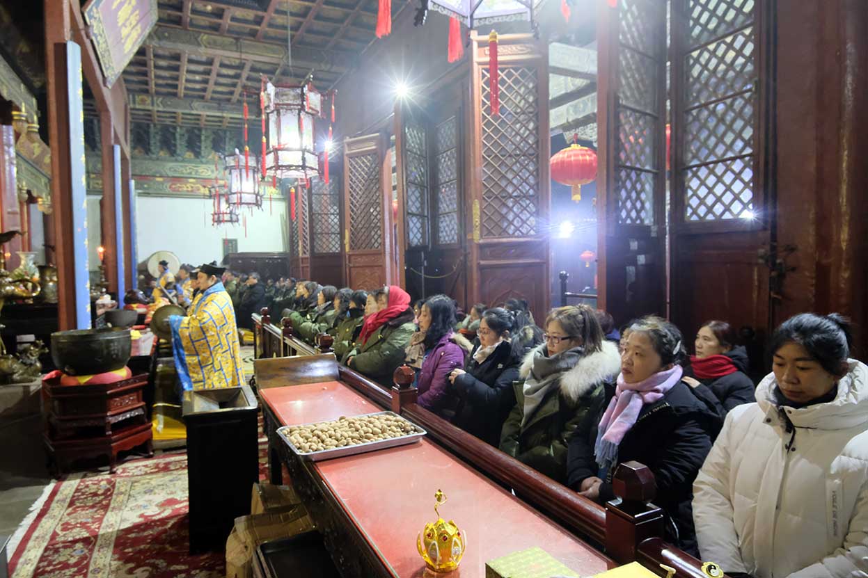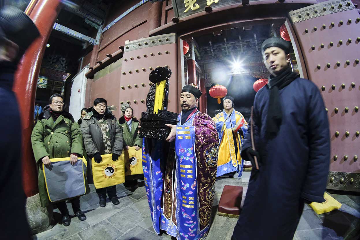 2020118日晚11点,己亥年腊月二十五子时,天开黄道,地发祥烟;上帝鉴观于下土,高真巡察于凡间;校勘神人之功过,俯赐群迷之嘉祥。泰山碧霞祠住持张诚达道长率领合庙道众云集法坛,各整朝班,谨依传统,如法如仪,奉行神圣庄严之接驾仪式,竭一诚而奉请,迓万圣以来临。