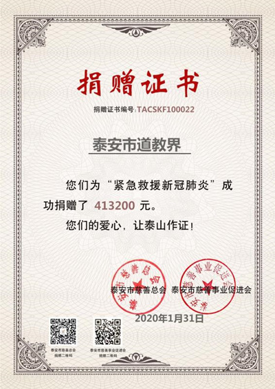 泰山道教界捐款41万余元抗击新型冠状病毒疫情