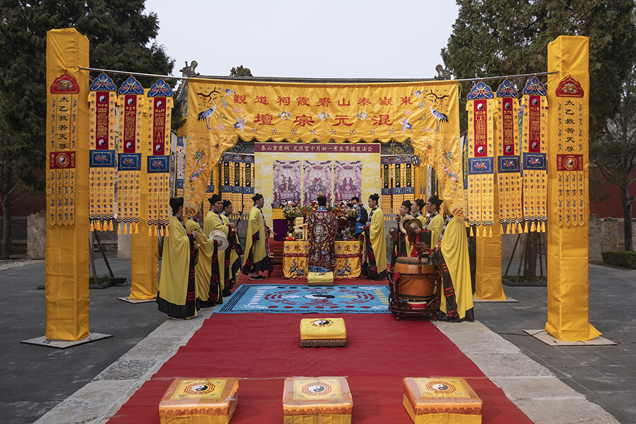 法会于当天二时开始。泰山灵应宫一进院内恭设法坛,住持张诚达道长率碧霞祠、灵应宫道众,谨按道教传统仪范,依次奉行城隍、摄召、安灵、祭孤、救苦诸科,晚六时判放全真青玄济炼铁罐施食,度亡生方,普济孤幽,共祈冥阳两利、国泰民安。
