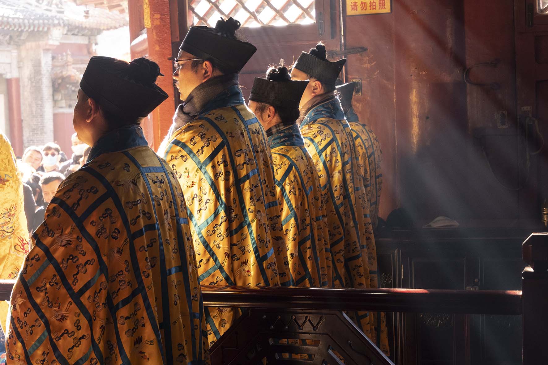 上午9时,道众在碧霞元君宝殿分列朝班,诵经演教,敲金振玉,祝祷国祚。张诚达道长拈香叩拜,呈进祈福疏文一函,至心祈愿:疫疠消散,瘟霾尽绝;时和岁稔,国泰民安。祝福十方善信新年大吉,阖家安康;和顺致祥,幸福美满!