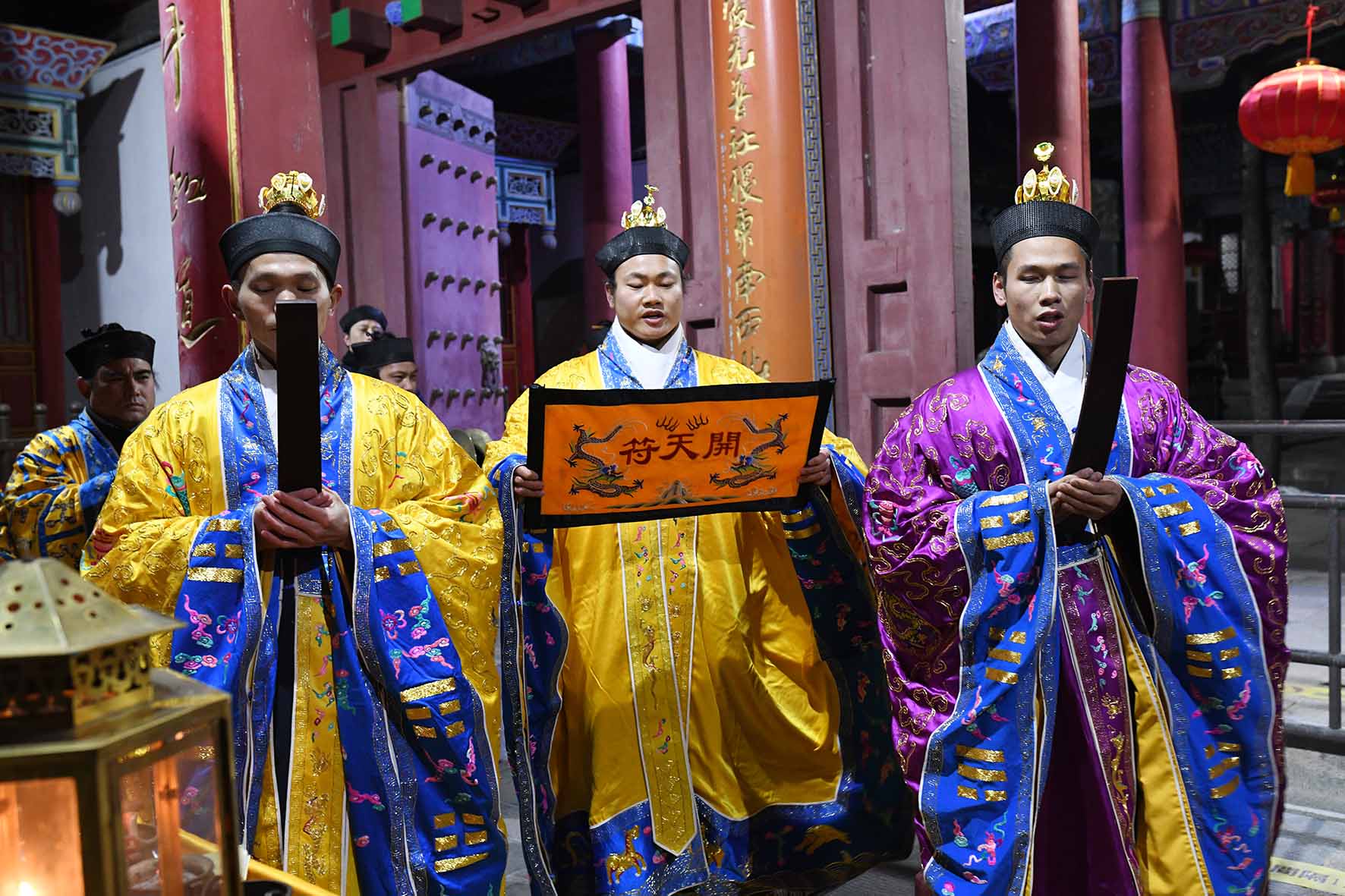 2021年2月5日深夜,农历腊月二十五子时,泰山碧霞祠谨按道教传统举行迎接玉皇圣驾仪式。由于正值暂停开放时期,道场仪式不对信众开放,住持张诚达道长率全庙道众如法依科诵经,为国家和十方信众祈福。志心祈愿: