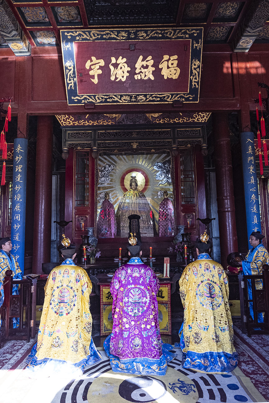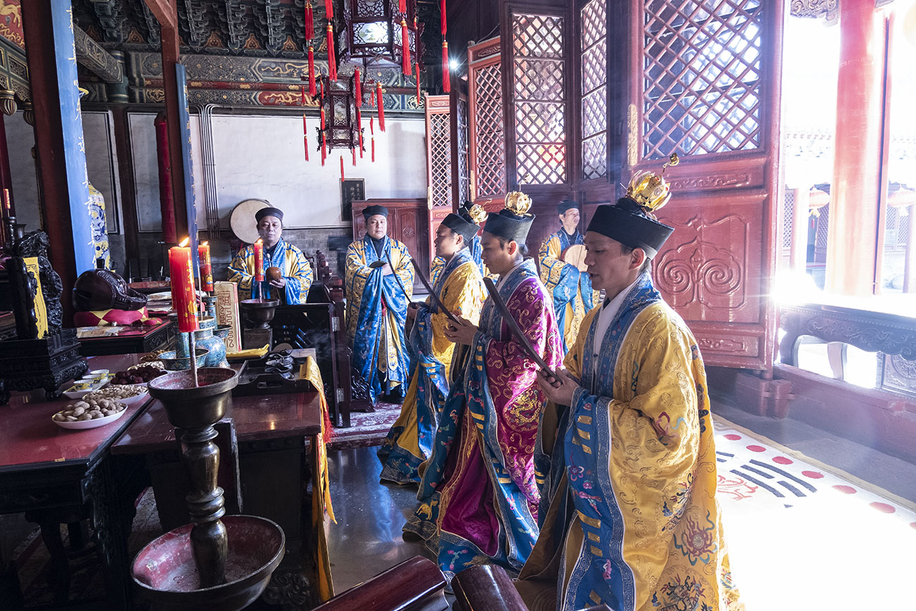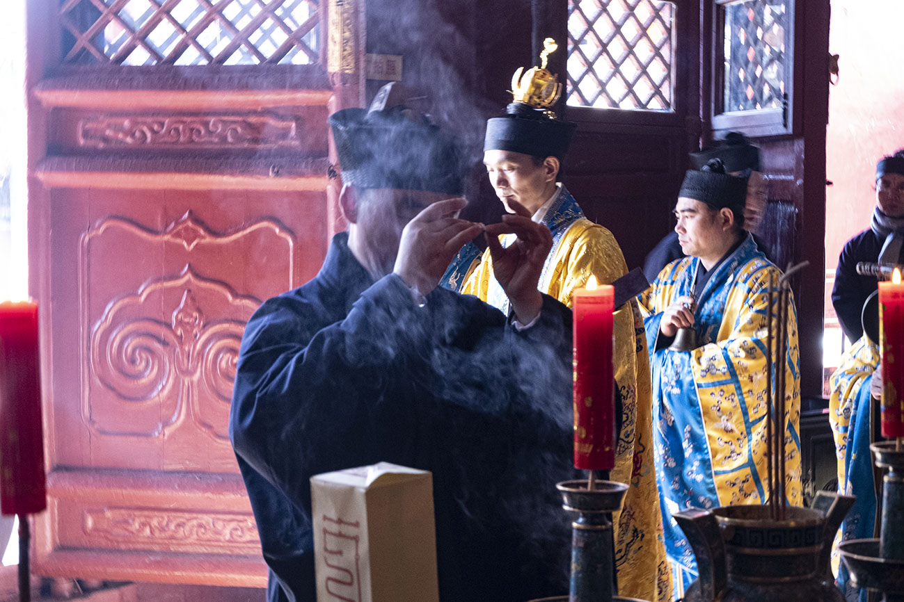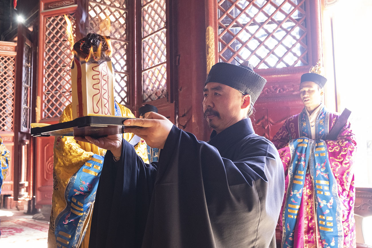 正月初九,乃玉皇大帝圣诞之期,泰山碧霞祠谨按道教传统如期举行庆贺祈福法会。由于正值暂停开放时期,法会全程不对外开放。住持张诚达道长率合庙道众云集大殿,设坛上供,讽演仙经;称扬圣号,虔诚礼拜,恭祝玉皇大帝圣寿,为国家和十方信众祈福。