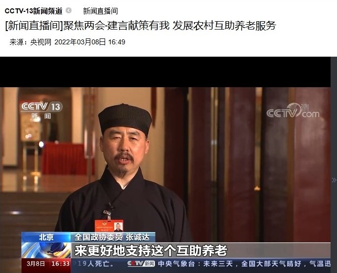 敬老爱老是中华民族传统美德。近年来,张诚达道长一直关注社会养老问题。现今,我国养老问题的重点和难点在农村,当前农村地区家庭养老功能日益弱化、独居和空巢化的情况日益加剧、社会化养老无力全面开展。在此背景下诞生的“互助养老”成为解决农村养老服务供给不足的有效途径,它以“集体建院,集中居住,自我保障、互助服务”为主要特征,通过低龄健康老人或志愿者照料帮扶高龄和失能老人,对独居老人、空巢孤寡老人、失能老人特别受用。张诚达道长呼吁全社会共同关注老年人生活,转变“养儿防老”的传统观念,积极开展“互助养老”模式,使得社会老年人“老有所养,老有所安”,安享幸福的晚年生活。