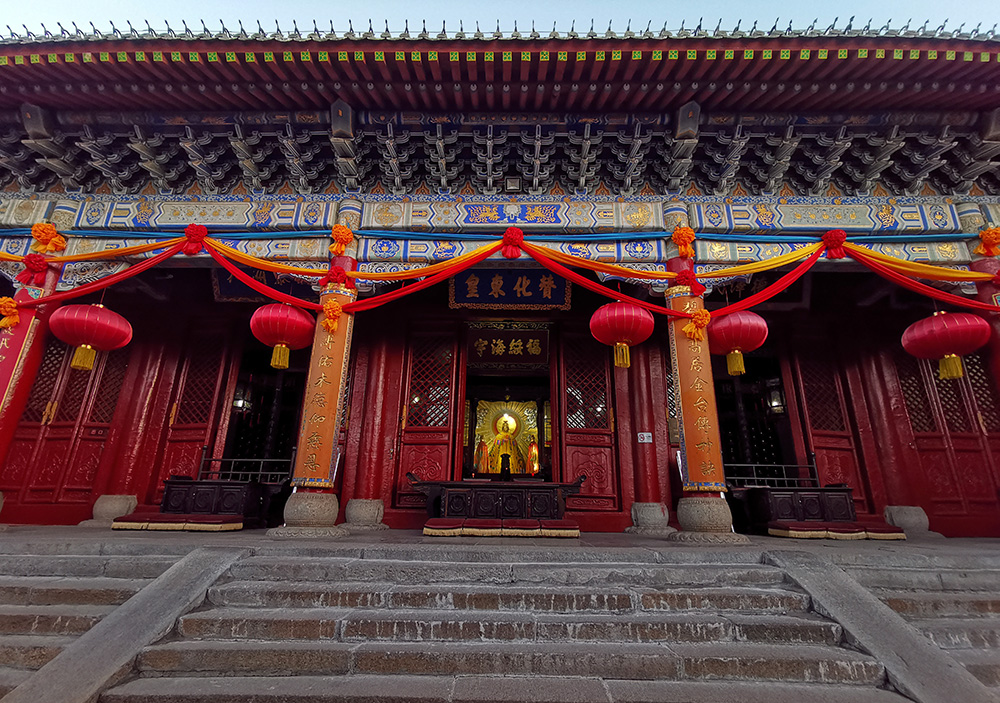 大殿顶覆三百六十垅铜瓦,以象周天之数,除盖瓦之外,鸱吻、檐铃,均为铜铸,檐下有乾隆御赐匾额“赞化东皇”。大殿5间,面阔24.7米,进深15.1米,通高13.7米,四柱七架梁,重梁起架,十一檩前后廊式,九脊歇山顶,四角施角柱。正间宽5米,次间宽4.4米,稍间宽3.45米,檐下施斗拱柱头科单杪双下昂六踩,斗拱上承托桃尖梁头,平身科各间数量不同,正间6柁,次间5柁,稍间4柁,均单杪双下昂五踩。斗拱上承托蚂蚱头,角科单翘重昂七踩,转角斗拱上承托宝瓶,檐下及后檐下亦施斗拱,形式与前面相同。屋面的筒瓦、大脊螭吻、垂脊、垂兽等构件皆铜铸。大脊上饰双凤缠枝花纹,戗脊有6个兽和1个仙人,檐上瓦钉处饰立体走龙,均为铜铸。歇山与山墙的交角处饰人物图案,每面9个。