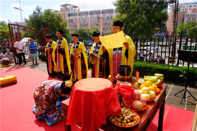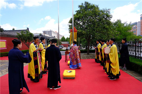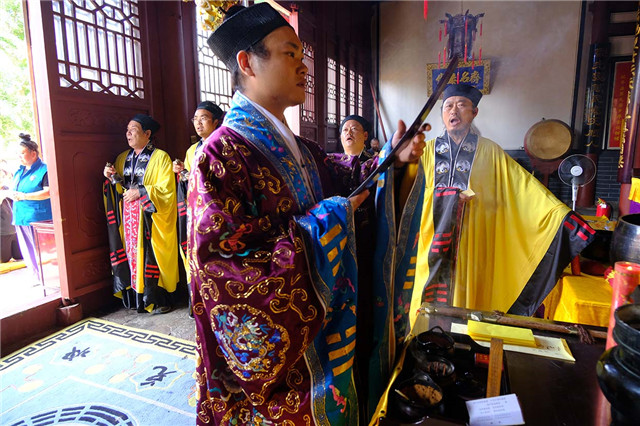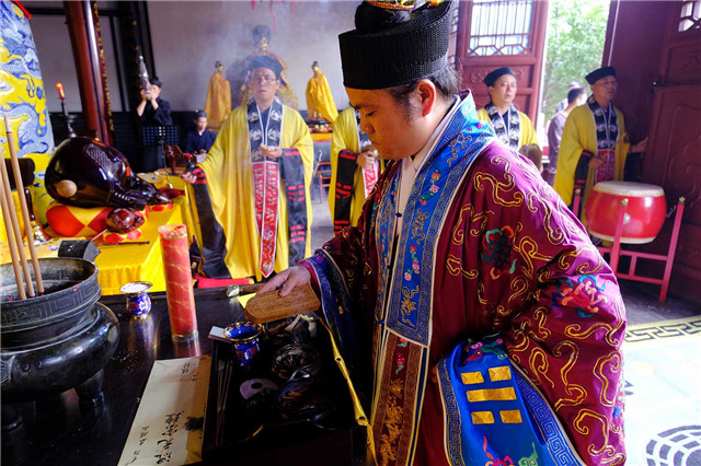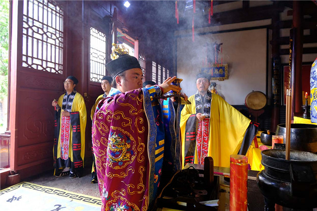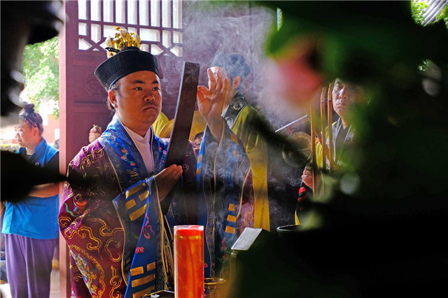 上午九时,道众云集大殿,谨按道教传统仪范,奉行开坛科仪。泰山碧霞祠、泰山灵应宫住持张诚达道长拈香开坛。