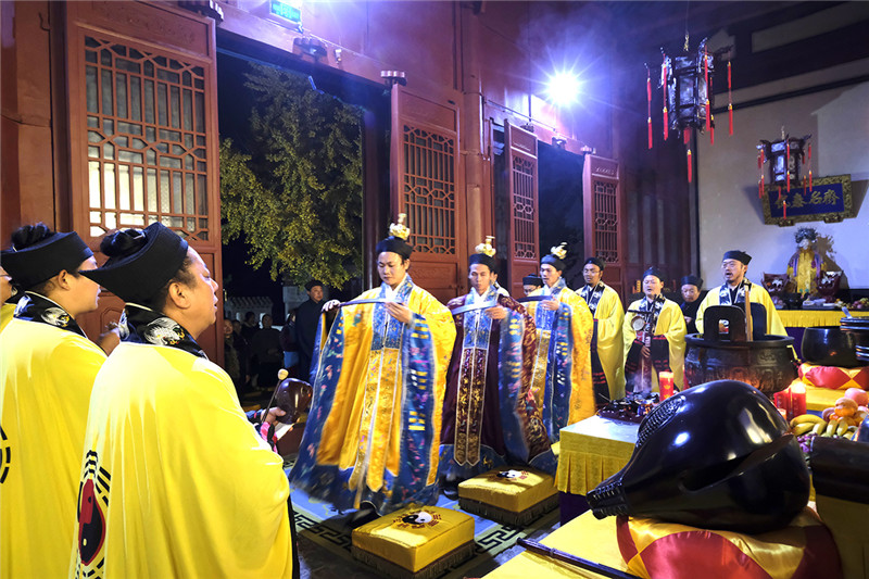 1110日晚,己亥年下元节前夕,中国道教协会副会长、山东省道教协会会长、泰安市道教协会会长张诚达道长率泰山道众,谨按道教传统,在泰山灵应宫举行下元五炁解厄水官圣诞祝寿祈福法会。