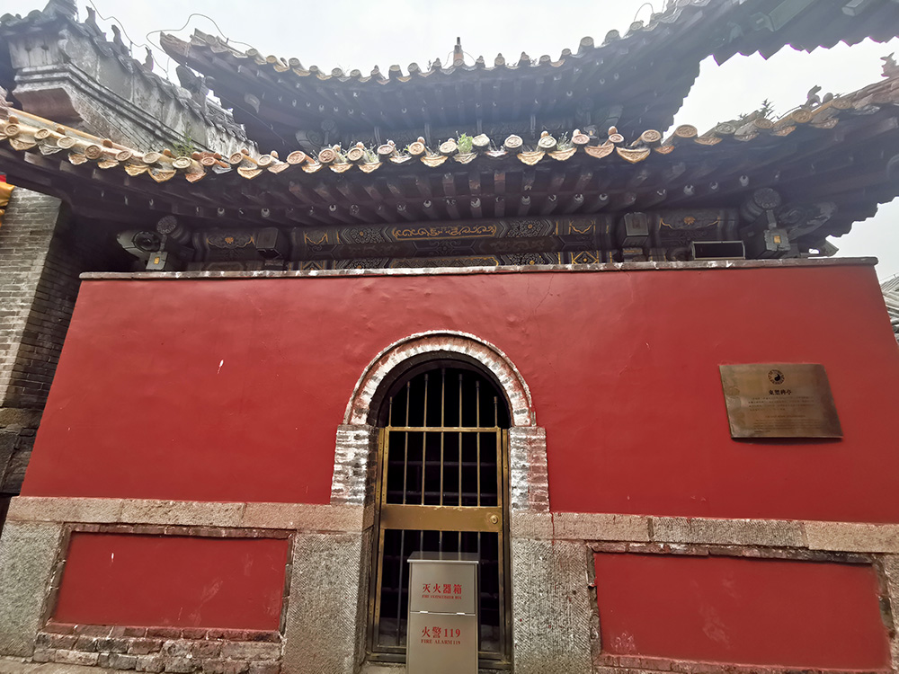 东御碑亭大山门后东侧,建于清道光十五年(公元1835)。方形,面阔进深均6.2,通高7.9,施四通柱,九脊重檐歇山顶,黄琉璃瓦盖顶。檐下施斗拱,一斗二升交麻叶头。下层四周砌墙。亭身开一南向门及向院内的门。斗拱檩枋上施墨线大点金彩绘。