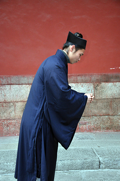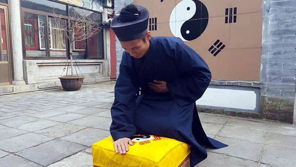 (5)叩首毕起身站定,此为一礼一叩。双手抱拳又一揖,准备第二次叩拜。如上重复两遍,是为三礼三叩。然后向后退半步再作一揖,原地转向值殿道长,躬身一揖,此时三礼三叩礼毕。