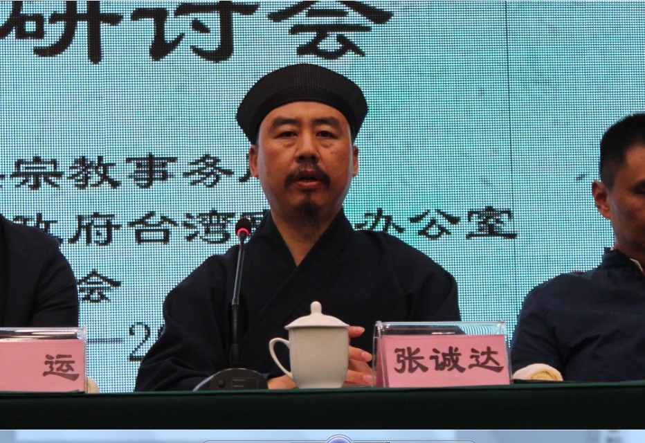 张诚达道长首先代表山东省道教协会在研讨会开幕式上作了致辞,并在随后的研讨会上进行了主题发言。张诚达道长的发言分别从“道法自然”的思想与可持续发展、“清静无为”的思想与心灵环保两个层面,深入浅出的论证了全真道思想对促进环境健康、社会健康、身体健康、心灵健康的积极作用。表示历代全真祖师创造的灿烂辉煌的思想文化,为后人留下了传承不断的宝贵遗产,作为中华优秀传统文化的传承者,两岸人民应当共同加以深入挖掘和弘扬。