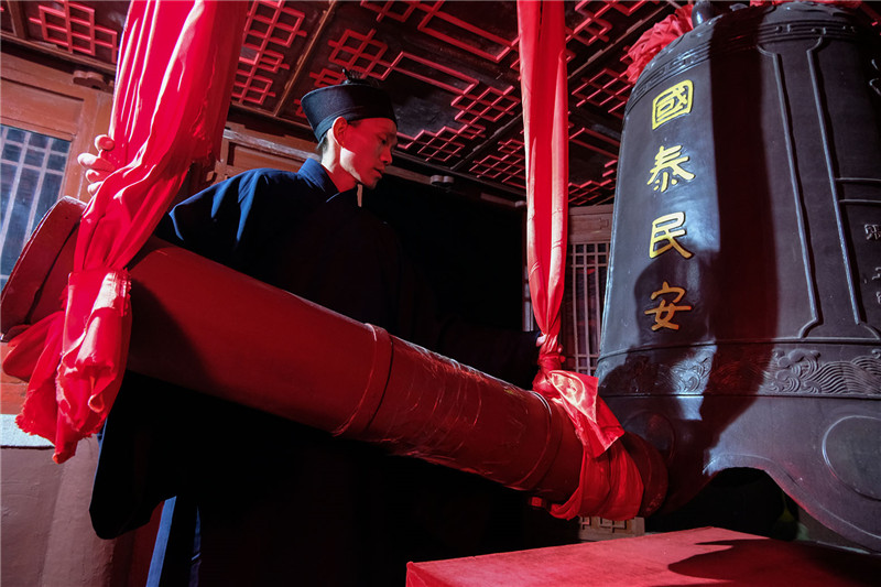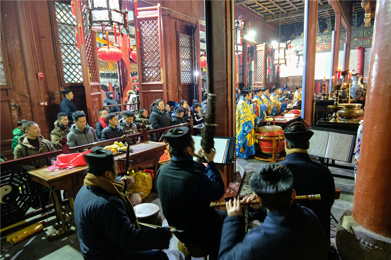 子时,己亥新年的第一次开静,执事道众敲响弘德楼巨钟,钟声响彻岱顶、遍及十方。道经有云:“朔旦洪钟初叩音,金铃空谷自传声,上叩圣神通天耳,下彻幽冥鬼神钦,上祝国祚万万岁,下保黎民皆太平,皇图巩固山河壮,文武禄位得迁升,无边世界干戈息,天长地久舜日临,远近善男信女等,增福延寿得康宁。”