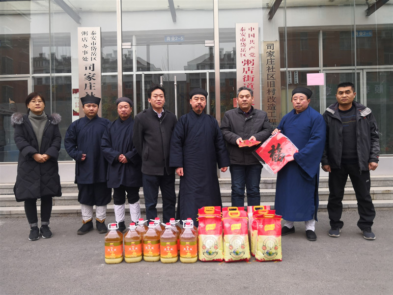 2019124日,腊月十九,己亥新春佳节即将来临之际,泰山碧霞祠组织开展了一次新年走访慰问特困家庭送福到家爱心活动。中国道教协会副会长、山东省道教协会会长、泰山碧霞祠住持张诚达道长率领碧霞祠道众及市道协工作人员,到岱岳区天平办事处和粥店办事处辖区内11个村落社区,走访慰问了30户特困家庭。