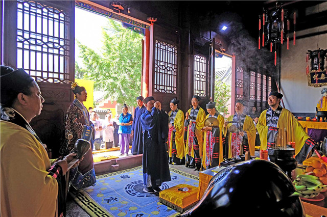 上午九时,道众云集大殿,谨按道教传统仪范,奉行开坛科仪。泰山碧霞祠、泰山灵应宫住持张诚达道长拈香开坛。