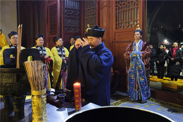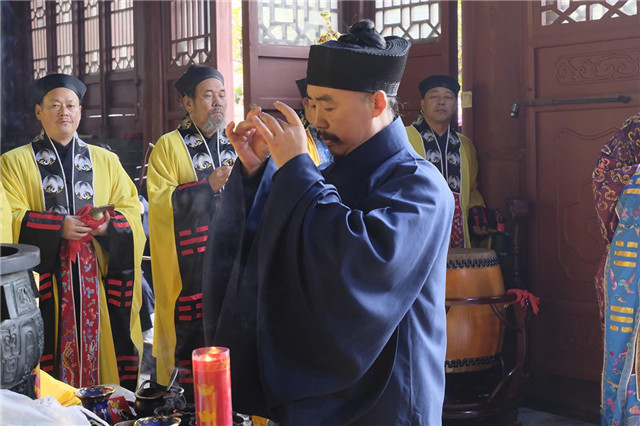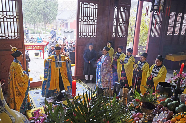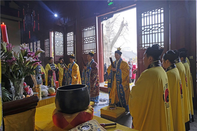 22日上午9时,中国道教协会副会长、山东省道教协会会长、泰山碧霞祠、泰山灵应宫住持张诚达道长率泰山道众,在灵应宫大殿整列朝班,讽经演教,庆贺元始天尊圣诞。