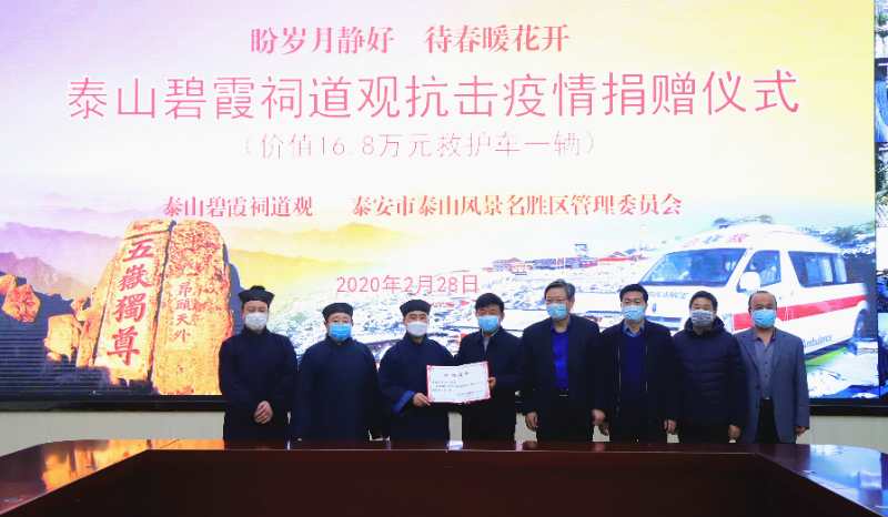 228日下午,泰山碧霞祠向泰山景区捐赠救护车仪式在泰山管委数控中心举行,泰山景区党工委书记亓利群,管委会主任王光锋,中国道教协会副会长、山东省道教协会会长、泰山碧霞祠住持张诚达道长出席捐赠仪式。