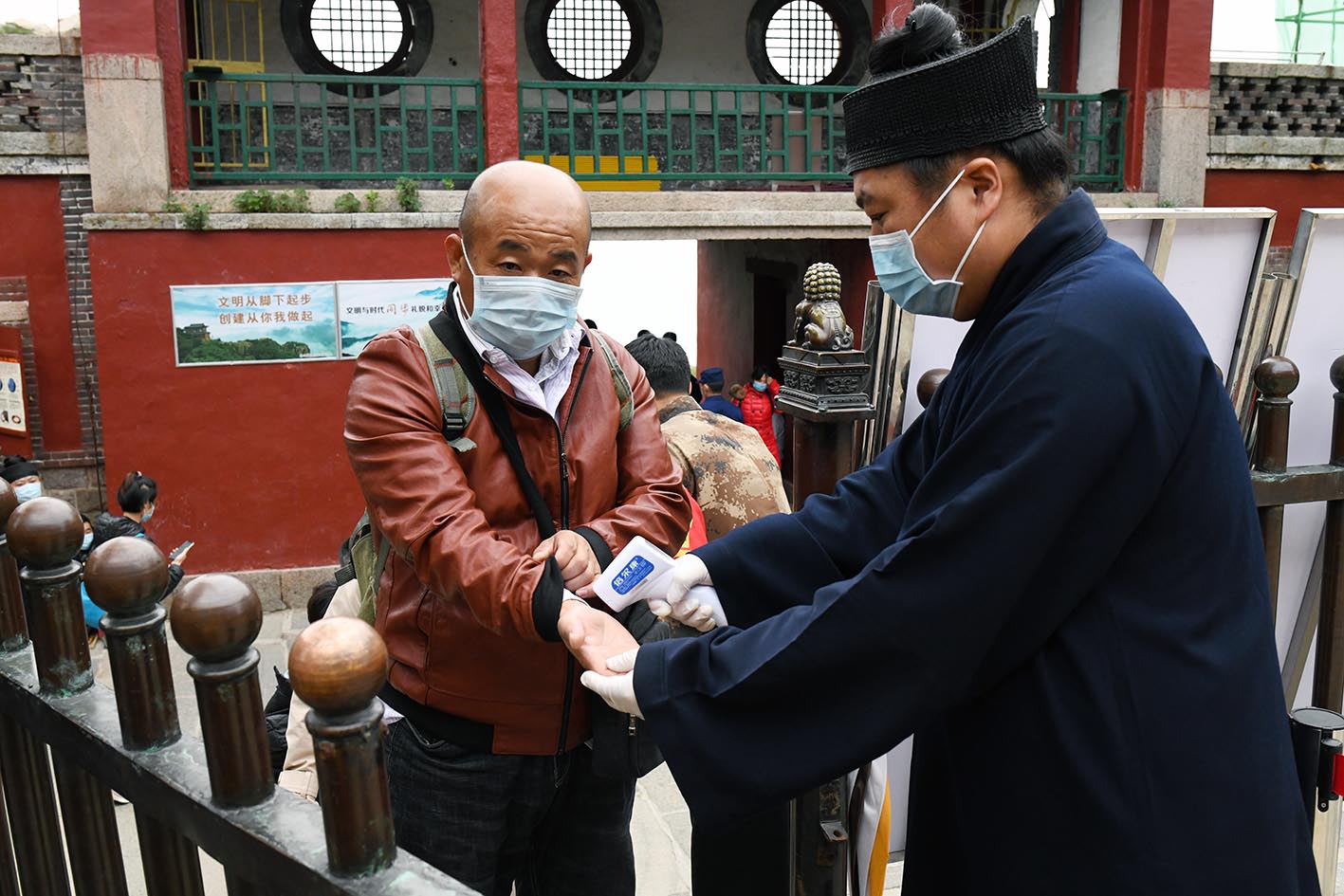 泰山碧霞祠恢复开放后,实行进出口通道分离,在碧霞祠山门前铜栏杆处开启东西两道侧门以供进出。在东边入口处设立有监测登记点,凡进庙者:须出示线上预约成功的信息、出示有效健康绿码,扫码登记或者详细登记姓名、身份证、电话号码等相关信息,并主动配合工作人员进行体温测量,体温低于37.3摄氏度并佩戴口罩者方可准许入庙。