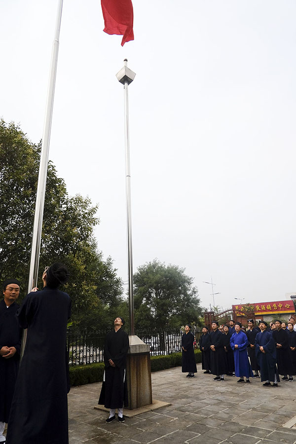 25日上午8时整,中国道教协会副会长、泰安市道教协会会长、泰山灵应宫住持张诚达道长率灵应宫全体道众、市道协及泰山道教文化馆工作人员,齐聚灵应宫山门前广场,整列队形,举行庄严的升国旗仪式。伴随着雄壮的国歌,鲜艳的五星红旗在灵应宫山门前冉冉升起,参加仪式的全体人员肃立注目,由衷表达对祖国的崇敬与热爱之情,在开启山门的第一天,共同祝愿国泰民安,风调雨顺,社会繁荣,民族昌盛。