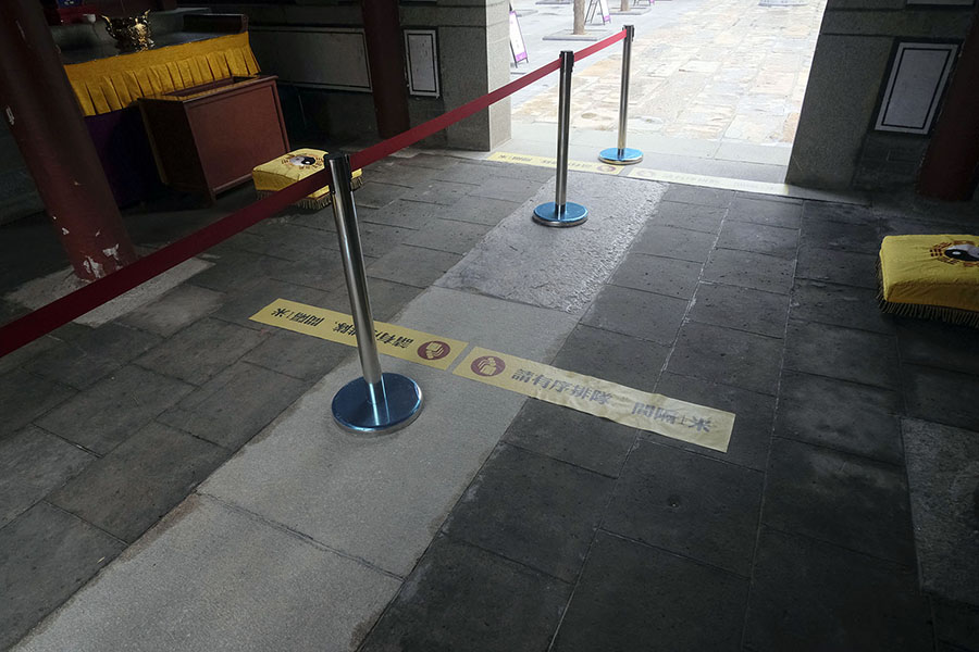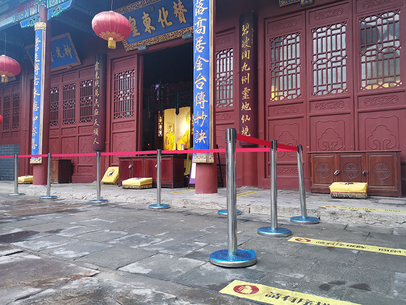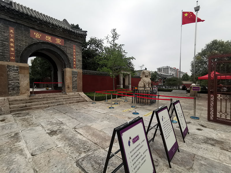 升旗仪式结束后,灵应宫正式开门开放。鉴于当前疫情防控形势,为保障广大信众的身体健康,泰山灵应宫实行“测温+健康绿码+全程正确佩戴口罩等准入措施,并严格控制进庙人员密度,实行瞬时最大接待量暂定为150人的措施,当进庙人员达到150人时,则 1人再进1。敬请各位信众香客主动配合本庙工作人员进行相关查验及防控管理。