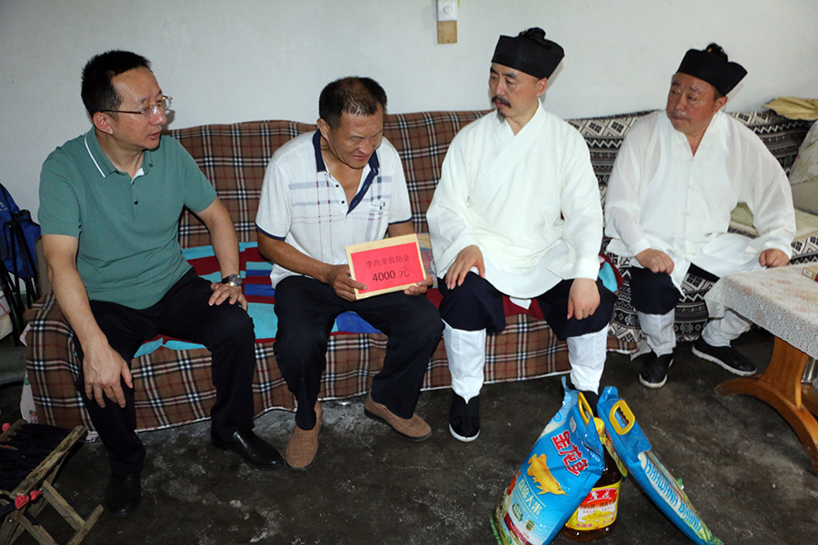 泰山碧霞祠一行来到岱岳区祝阳镇、范镇,泰山景区下港镇,实地走访了部分困难家庭。在困难家庭家中,张诚达道长与他们亲切交谈,详细了解患病家庭的基本情况和致贫原因,为他们送去了大米和食用油,并代表泰山道教界为每户困难家庭送上4000元救助金,鼓励村民坚定信念,树立信心,生活一定会越来越好。困难家庭对道教界义举表示衷心感谢。