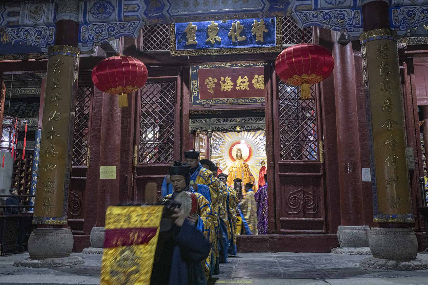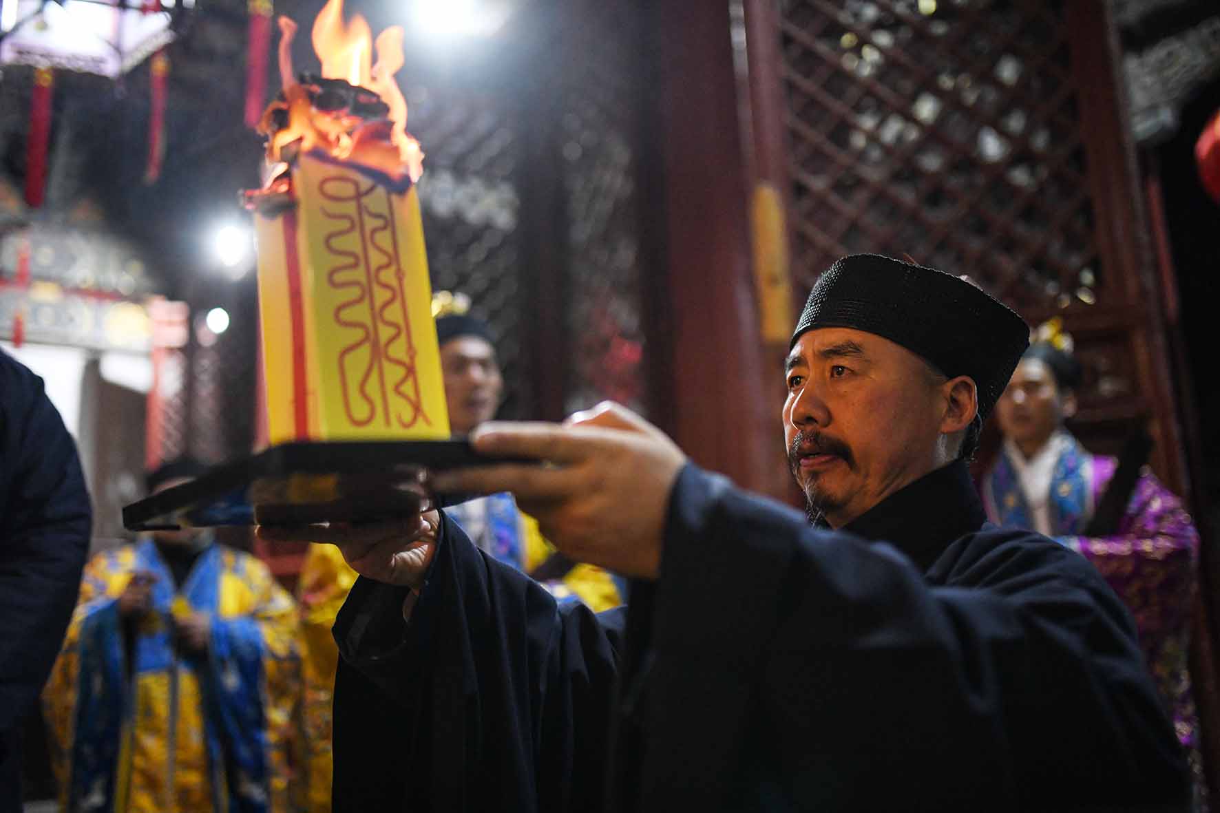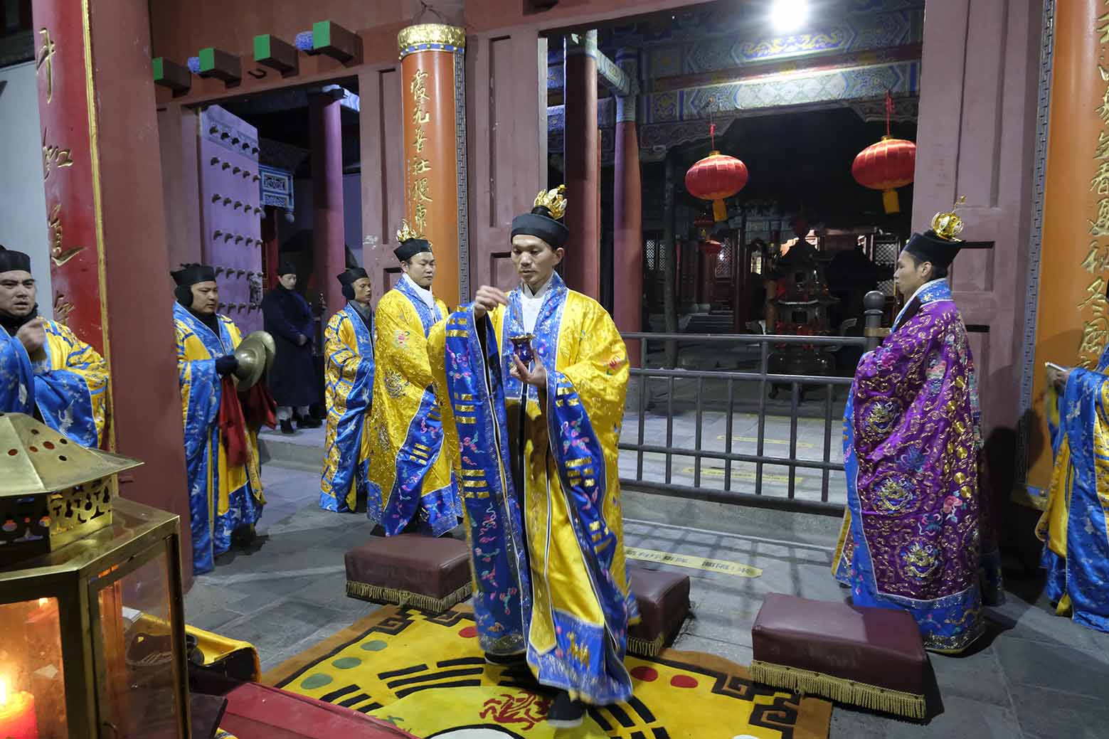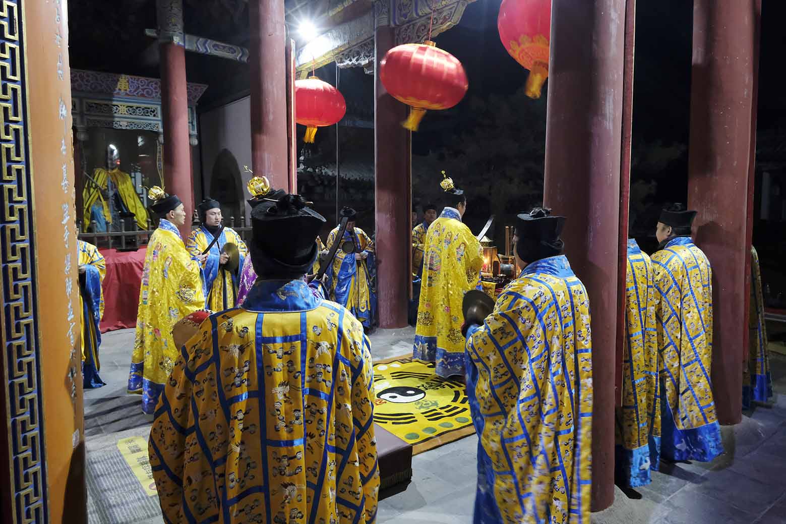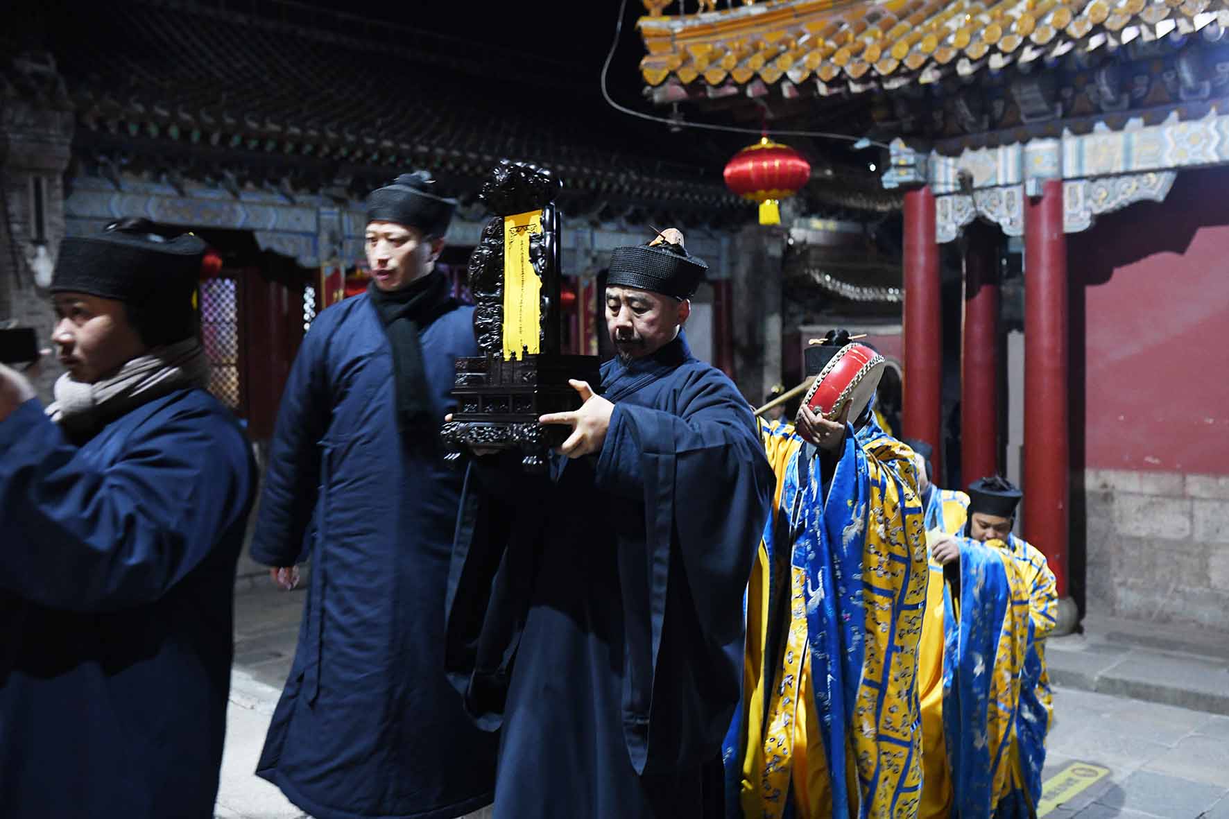 2021年2月5日深夜,农历腊月二十五子时,泰山碧霞祠谨按道教传统举行迎接玉皇圣驾仪式。由于正值暂停开放时期,道场仪式不对信众开放,住持张诚达道长率全庙道众如法依科诵经,为国家和十方信众祈福。志心祈愿: