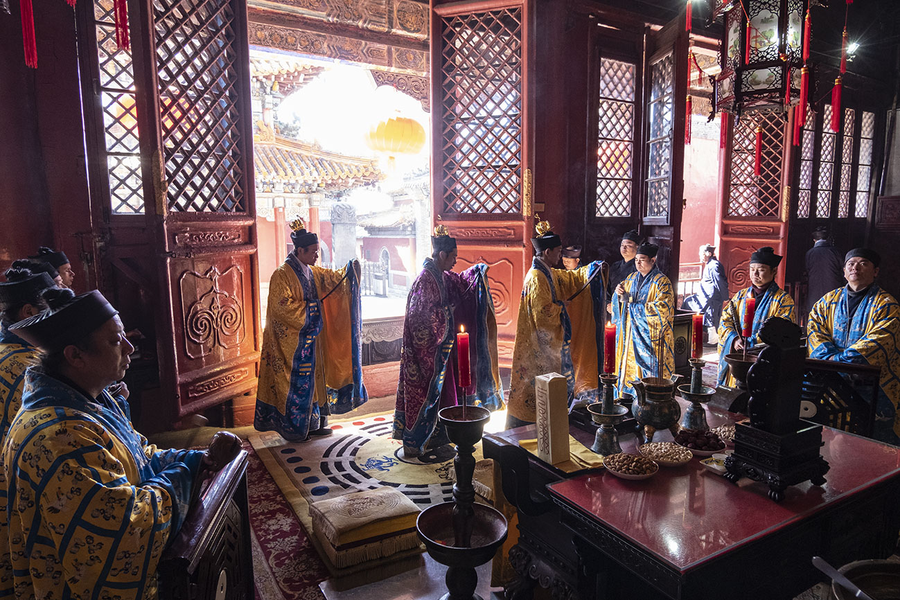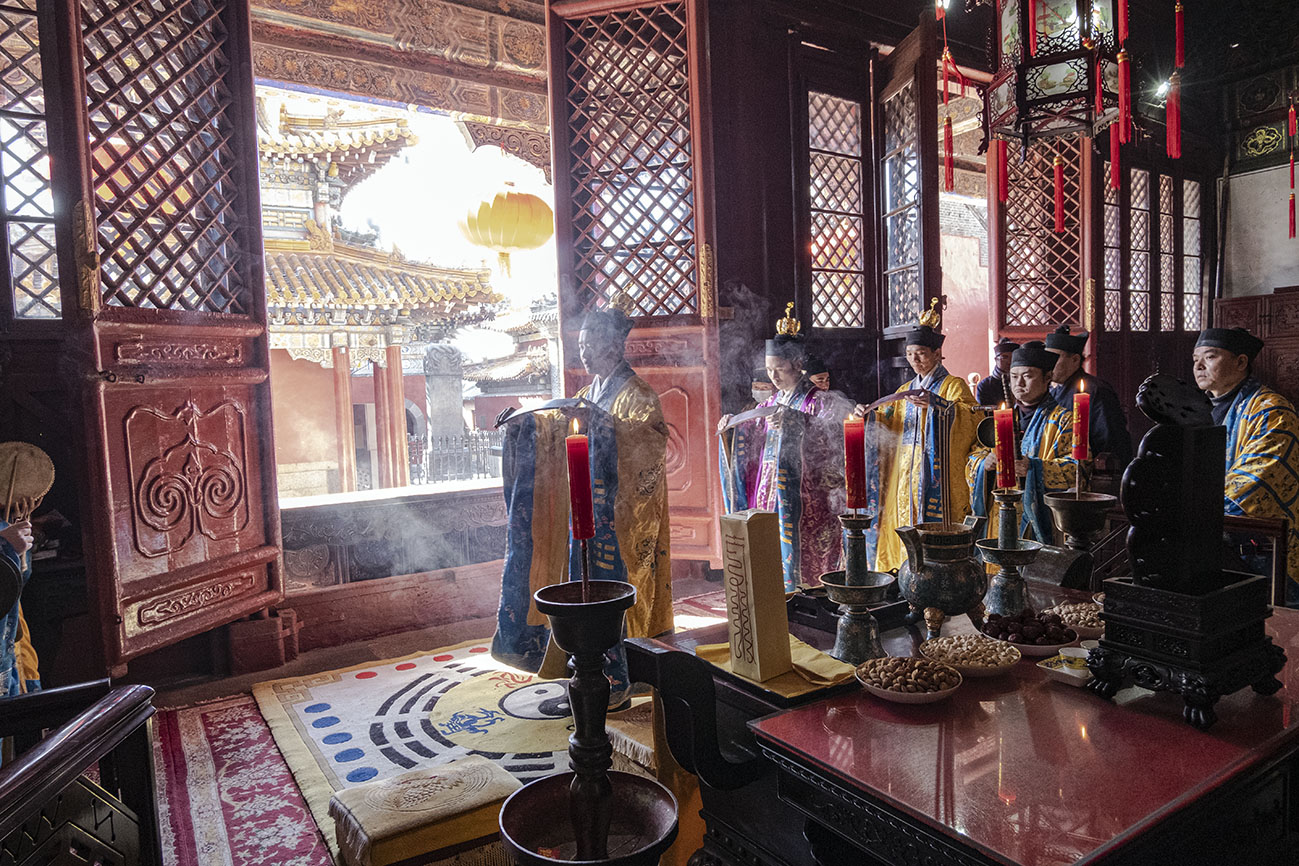 正月初九,乃玉皇大帝圣诞之期,泰山碧霞祠谨按道教传统如期举行庆贺祈福法会。由于正值暂停开放时期,法会全程不对外开放。住持张诚达道长率合庙道众云集大殿,设坛上供,讽演仙经;称扬圣号,虔诚礼拜,恭祝玉皇大帝圣寿,为国家和十方信众祈福。